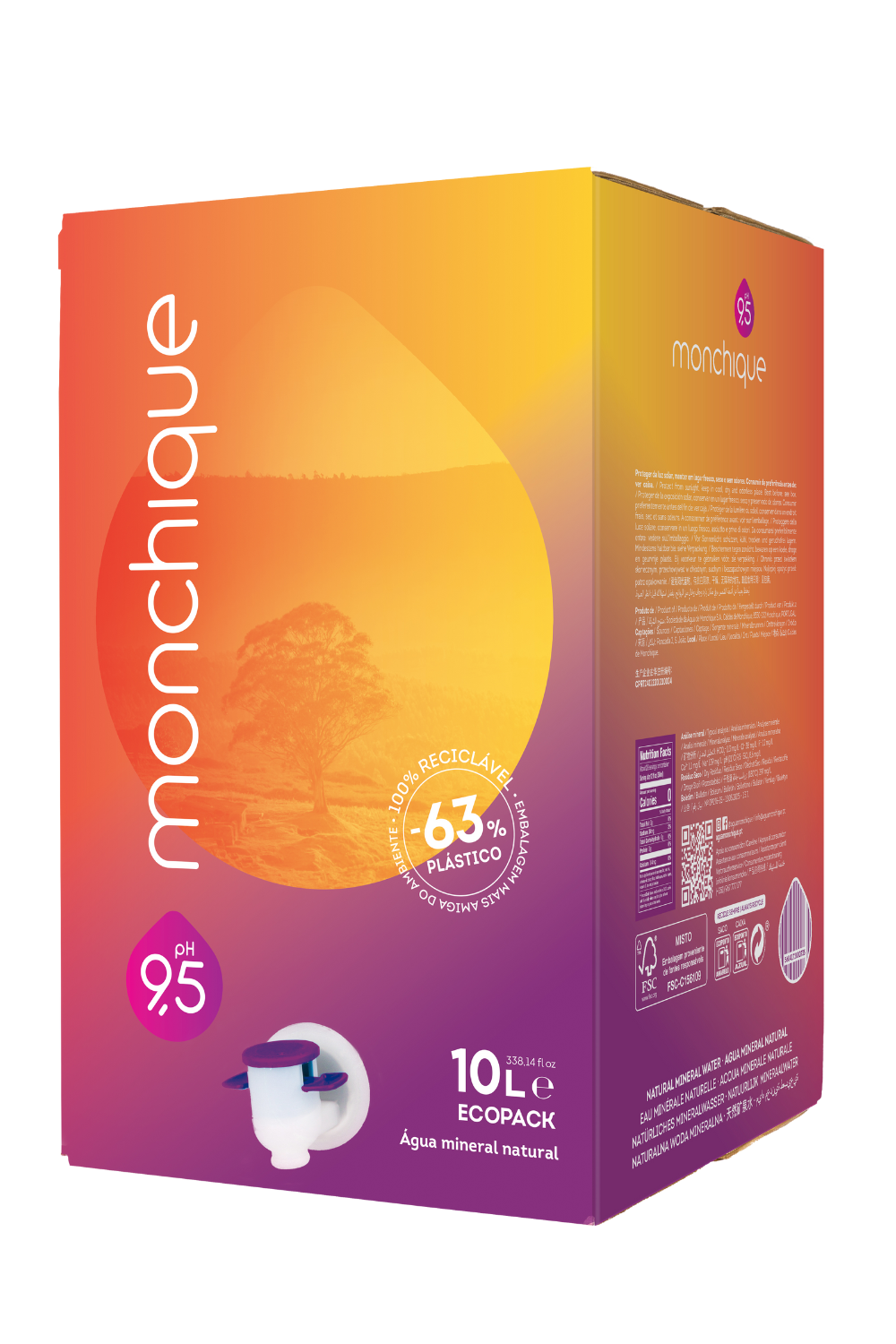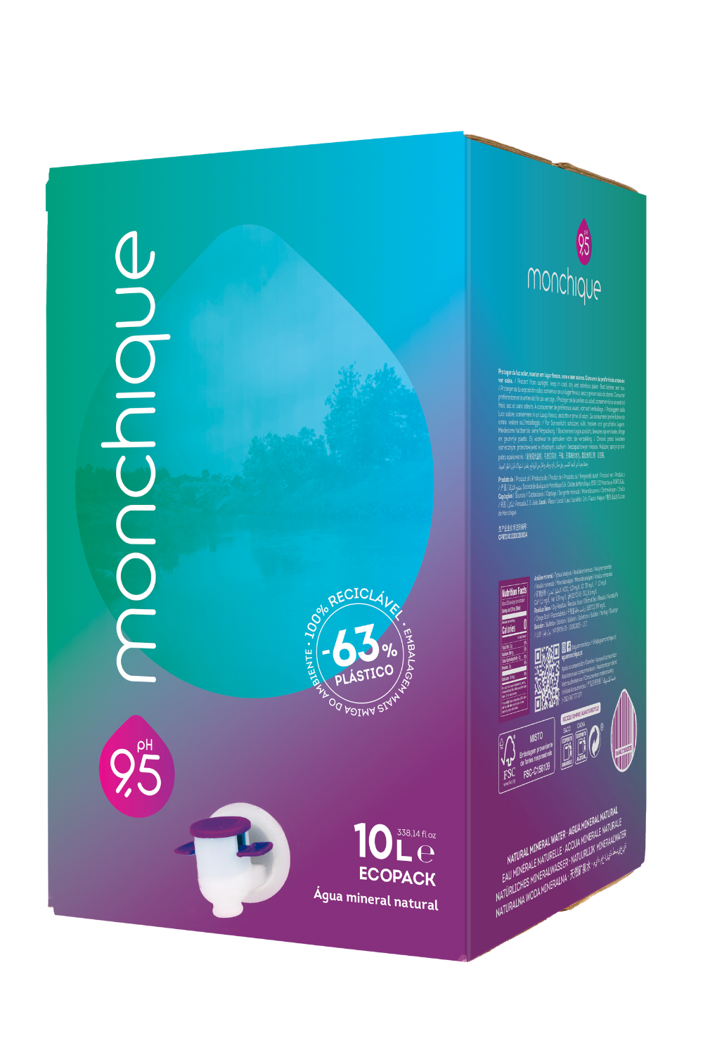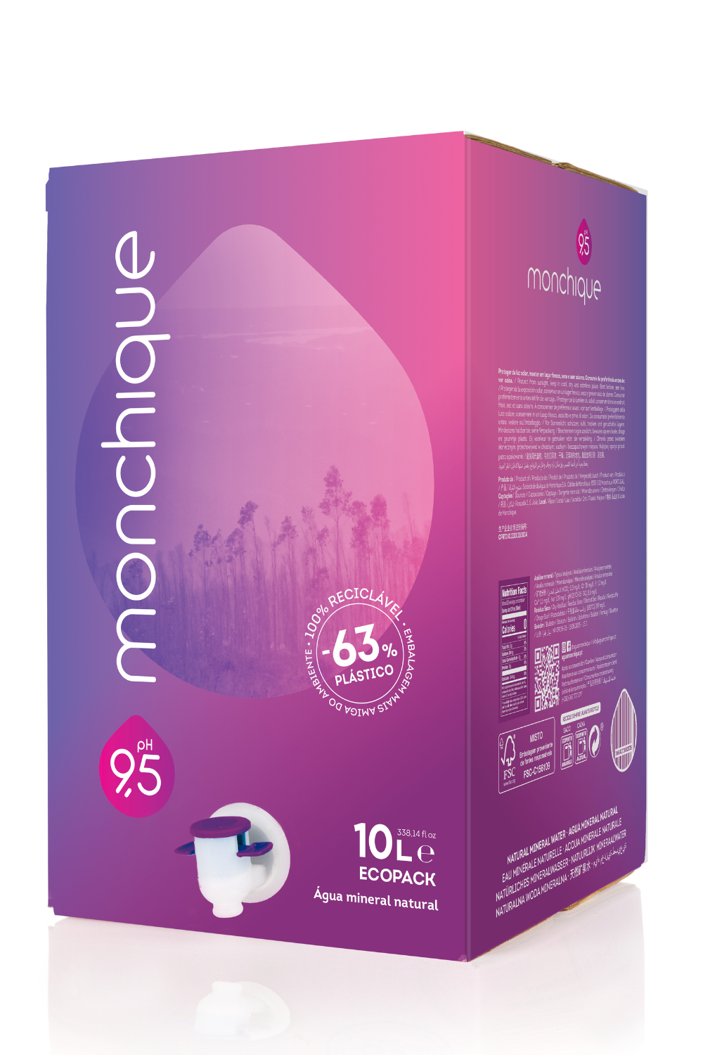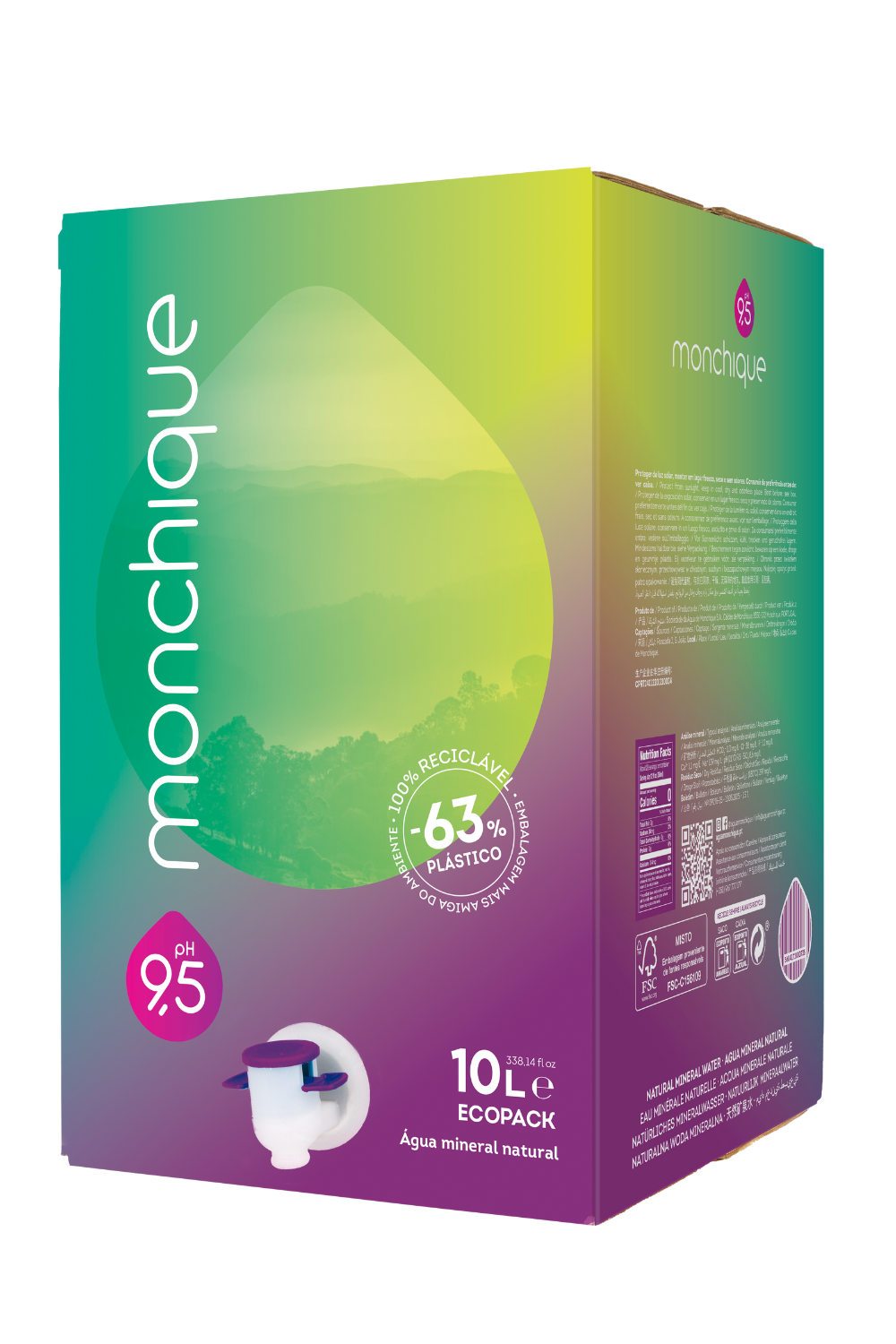 Água Mineral Alcalina Monchique em embalagem ecológica com -63% de plástico face ao PET utilizado para produção de dois garrafões de 5L